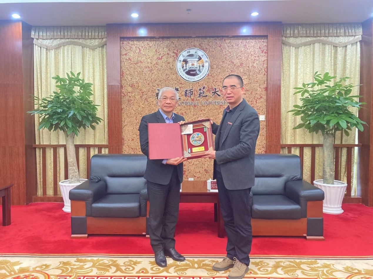 On February 28, a delegation from Shih Hsin University in Taiwan, led by President Chen Ching-Ho and Vice President Fedrick Lee Kung-Chin, visited Fujian Normal University (FNU). They were warmly received by President Zheng Jiajian and Vice President Ouyang Songying. The meeting was also attended by heads of relevant departments, including the Party and Administration Office, the Taiwan, Hong Kong, and Macao Affairs Office, the School of Communication, and the College of Cultural Tourism & Public Administration.