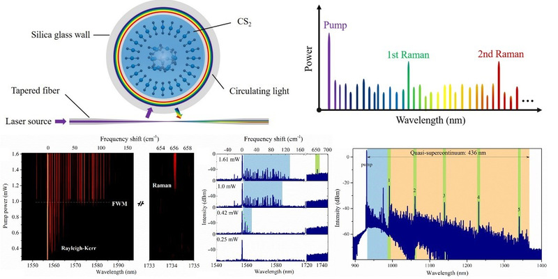 With the solid high quality (Q) factor and small mode volume, whispering-gallery mode microcavities are demonstrated as an excellent experimental platform for studying nonlinear optics and new micro photonic devices, which can provide strong enhancement to light–matter interactions. However, most previous studies were restricted to solid state microcavities. Compared to solid materials, liquid materials have 2-3 times higher nonlinear coefficient, and liquid anisotropic molecule is unique for abundant vibrational and rotational degrees of freedom. Accordingly, liquid materials have great potential in functional photonic devices and exploring the new physics.