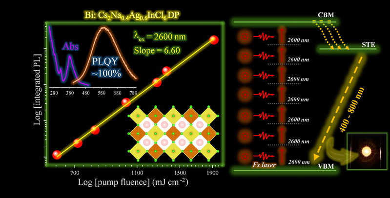 Recently, Prof. Chen Daqin's research group of FNU, together with Chen Xueyuan, researcher of Fujian Institute of Research on the Structure of Matter (FJIRSM), Chinese Academy of Sciences (CAS), prepared Cs2Na0.4Ag0.6In1-xBixCl6 double perovskites with superior stability and nearly 100% luminescence efficiency by aliovalent substitution. Density functional theory calculations verify the effect of Na/Bi alloying on optical absorption of double perovskites, which can be pumped by a femtosecond laser in a wide spectral range (800–2600 nm), and nonlinear multi-photon (2–7) absorption in lead-free double perovskites was observed for the first time.