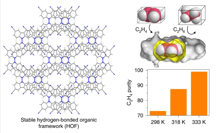 Currently, ethylene/ethane separation is an important and energy-intensive industrial process. Professor Zhang Zhangjing’s team have reported a microporous hydrogen-bonded organic framework (HOF), consisting of tetracyano-bicarbazole building blocks held together through intermolecular C–N···H–C hydrogen bonding interactions. The HOF can stay stable under harsh conditions, including exposure to water, strong acids and bases, and some other highly polar solvents. It is flexible and takes up ethylene with very good selectivity over ethane through a gating mechanism with unique temperature adjustment. At 60 °C, close to the temperature of a gas mixture in a real industrial process, the HOF-FJU-1 manages to produce high purity of ethylene from fixed bed columns.