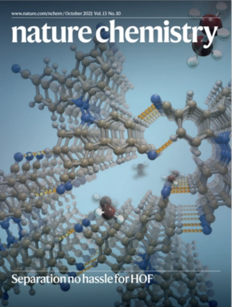 Recently, the research result, entitled “Ethylene/ethane separation in a stable hydrogen-bonded organic framework through a gating mechanism”, was published in the international top journal Nature Chemistry (IF=24.427), selected as the cover of that issue, and highly evaluated by Nature Chemistry, with the title of “Separation no hassle for HOF”. The first author of the paper is Dr. Yang Yisi, a doctoral student of Class 2019 of FNU, with Professor Zhang Zhangjing, Professor Xiang Shengchang and Professor Chen Banglin of University of Texas at SAN Antonio as the corresponding authors. The work is sponsored by the National Natural Science Foundation of China, and such projects as the Major Science and Technology Projects of Fujian Province.