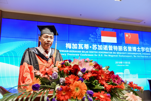 Professor Li Baoyin, Party Secretary of the University Council, stated in his speech that FNU and Indonesia have had extensive collaboration and achieved fruitful results in people-to-people communication, academic research, teaching Chinese as a foreign language and Confucius Institutes development. HE Ibu Megawati Soekarnoputri has long been committed to promoting China-Indonesia exchanges and made significant contributions to the friendship between China and Indonesia and the economic and cultural exchanges between Fujian Province and Indonesia. In recognition of her vision and her important contributions to the relations between China and Indonesia, FNU decided to award her the Honorary Doctorate. He also expressed the hope that HE Ibu Megawati Soekarnoputri would bring the educational and cultural exchanges between FNU and Indonesia to a new height, so that the two sides could work together to contribute more to the development of the Belt and Road Initiative and the common good of the people of both countries.