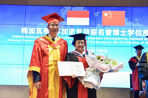 On the morning of November 5, an honorary doctorate conferment ceremony was held at the Hongda Hall on the Qishan campus for Her Excellency Ibu Megawati Soekarnoputri, the chairwoman of the Indonesian Democratic Party of Struggle (PDI-P) and the 5th President of the Republic of Indonesia (RI). Present at the ceremony were HE Megawati Soekarnoputri, Dr. Budi Gunawan, Chief of the Indonesian State Intelligent Agency, Mr. Djauhari Oratmangun, Indonesian Ambassador to China, Prof. Abdullah Mahmud Hendropriyono, Former Chief of the Indonesian State Intelligent Agency, Prof. Purnomo Yusgiantoro, former Indonesian Minister of Energy and Mineral Resources, Prof. Rokhmin Dahuri Ismail, former Indonesian Minister of Marine Affairs and Fisheries, families and friends of HE Megawati Soekarnoputri, Mr. Chen Chuxin, Standing Member of the CPC Committee of the Foreign Affairs Office of the Fujian Provincial People’s Government and Vice Chair of the Association for Friendship with Foreign Countries of Fujian Province, leaders of FNU including Prof. Li Baoyin, Prof. Wang Changping, Prof. Ye Shen and Prof. Lai Hairong, and heads FNU’s relevant functional departments, colleges and the Indonesian Research Center, as well as representatives of faculties and students. The ceremony was hosted by Prof. Lai Hairong, Vice President of FNU.