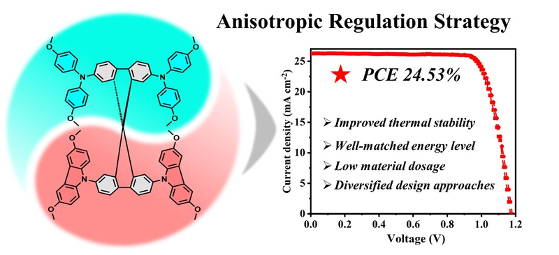 Recently, using an anisotropic regulation strategy, Academician Huang Wei and Professor Wang Yang of Strait Institute of Flexible Electronics (SIFE, Future Technologies), Associate Professor Wei Dong of College of Physics and Energy, and Researcher Gao Peng of Fujian Institute of Research on the Structure of Matter (FJIRSM) of Chinese Academy of Sciences, designed and synthesized a novel spiro-type molecule, SF-MPA-MCz, featuring enhanced thermal stability and hole mobility, and more uniform and compact film morphology, when compared to Spiro-OMeTAD, which contribute to the formation of a hole transporting layer at the lower concentrations of SF-MPA-MCz solutions (~30 mg/ml) and a remarkable power conversion efficiency (PCE) of 24.53% for PSCs employing SF-MPA-MCz with long-term operational stability while maintaining a low synthesis cost. The work, titled De novo Design of Spiro-type Hole-transporting Material: Anisotropic Regulation toward Efficient and Stable Perovskite Solar Cells, has been published in the journal Research.