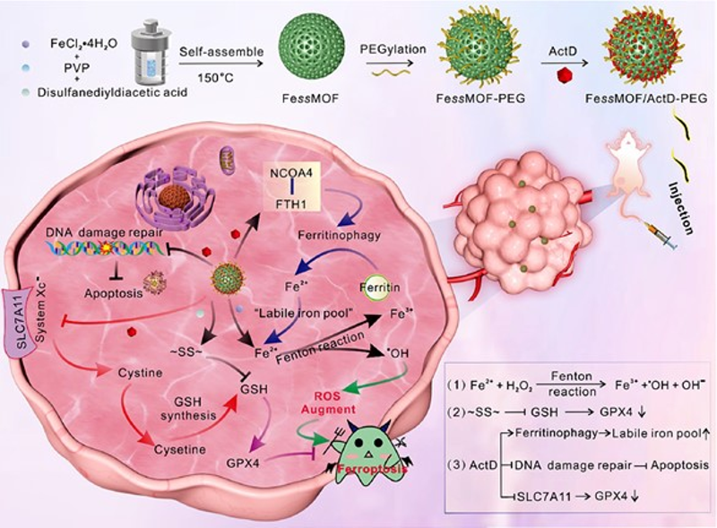 Based on the team’s previous innovative work in breast cancer treatment (Adv. Mate. 2019, 31(46): 1905825; Chem. Eng. J. 2023, 452: 138422; 2023, 452: 139517; Adv. Healthcare Mater. 2024: 2304522; 2024, 13(4): 2302537; Int. J. Bio. Macromol. 2024, 258: 128952), Zeng Xuemei’s research team from the College of Life Sciences of FNU and Prof. Yan Shuangqian’s research team from the Straits Institute of Flexible Electronics (SIFE, Future Technologies), jointly demonstrate a highly effective tumor ferrotherapy using iron (II)-based metal-organic framework (FessMOF) nanoparticles, assembled from disulfide bonds and ferrous ions. The as-prepared FessMOF nanoparticles exhibit peroxidase-like activity and pH/glutathione-dependent degradability, which enables tumor-responsive catalytic therapy and glutathione depletion by the thiol/disulfide exchange to suppress glutathione peroxidase 4. Upon PEGylation and Actinomycin D (ActD) loading, the resulting FessMOF/ActD-PEG nanoplatform induces marked DNA damage and lipid peroxidation. Concurrently, the teams find that ActD can inhibit Xc- system and elicit ferritinophagy, which further boosts the ferrotherapeutic efficacy of the FessMOF/ActD-PEG. In vivo experiments also demonstrate that the fabricated nanoplatform presents excellent biocompatibility and a high tumor inhibition rate of 91.89%.