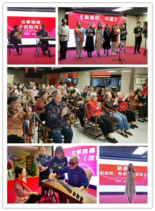 活动现场,志愿者手把手教爷爷奶奶弹奏古筝,并合作演出《浏阳河》《一只鸟崽》两首经典曲目;校友郑平生爷爷还献上了碗琴弹奏表演,两首歌曲《友谊地久天长》和《欢乐颂》将活动推向高潮。